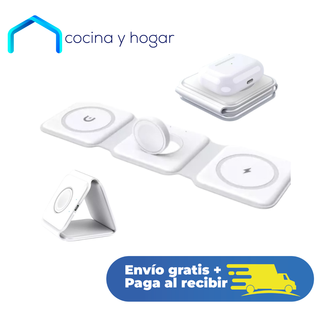 El Cargador Inalámbrico 3 en 1 elimina la necesidad de múltiples cargadores y cables, permitiéndote cargar tu teléfono, reloj y audífonos al mismo tiempo. Simplifica tu vida con un solo dispositivo que se adapta a tus necesidades.
