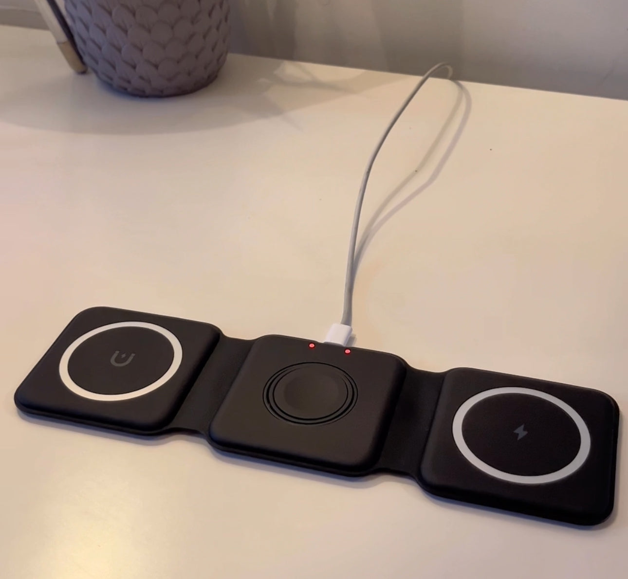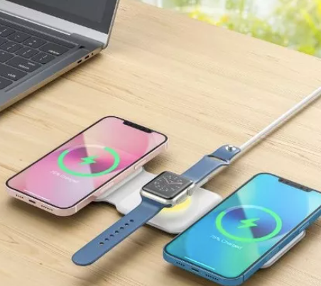Sí, puedes cargar hasta tres dispositivos simultáneamente: tu teléfono, reloj y AirPods, sin problemas. El diseño 3 en 1 permite cargar múltiples dispositivos a la vez, ahorrando espacio y tiempo.