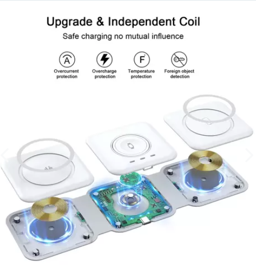 El diseño plegable del Cargador Inalámbrico 3 en 1 es perfecto para llevarlo en tu bolso o equipaje sin ocupar espacio. Gracias a su fuerza magnética, se pliega de manera compacta y segura.